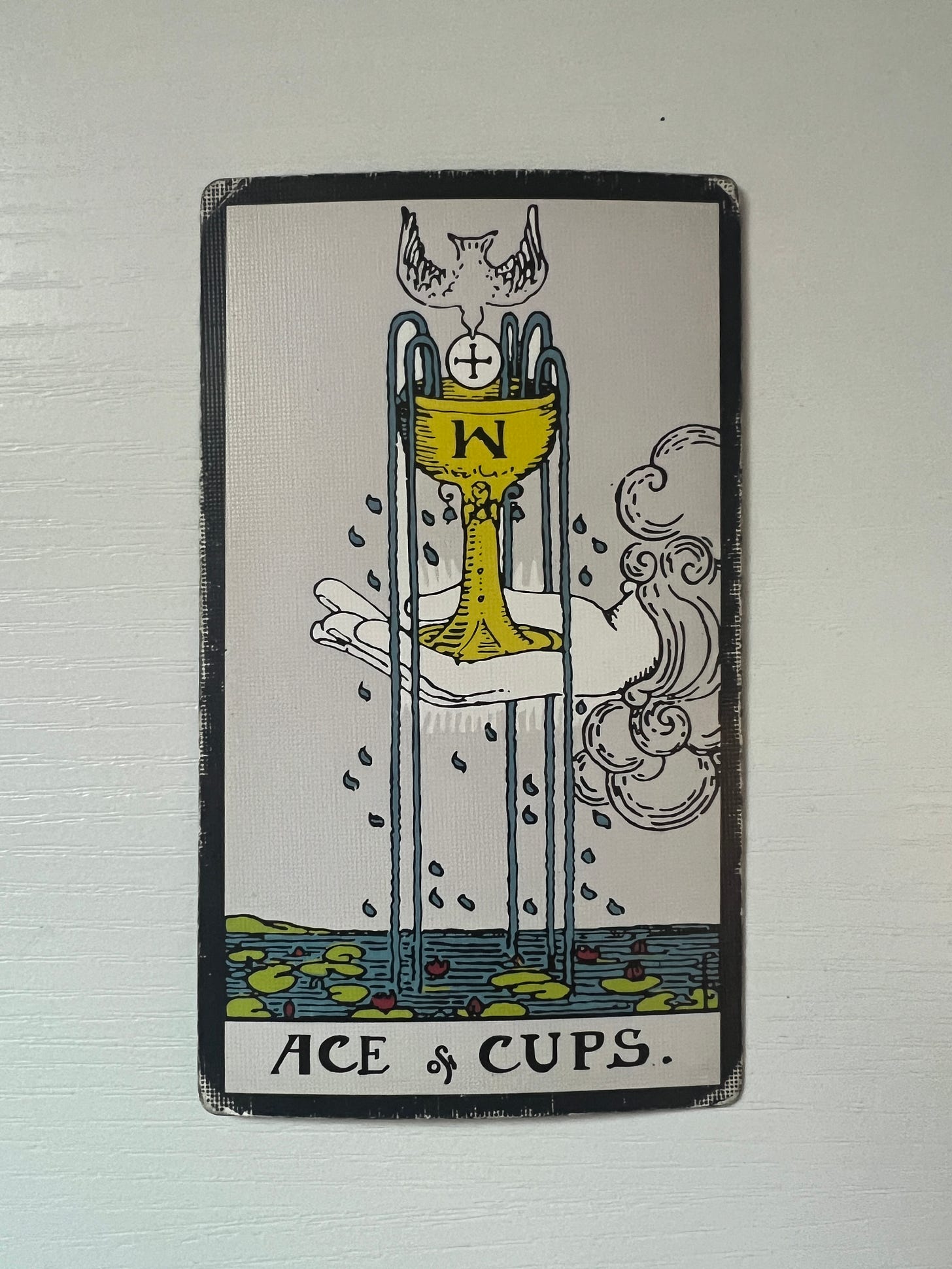 Today, I’m drawn to the dove above the goblet holding a symbol in its beak. The symbol is similar to the symbol for the Vertex in astrology. The Vertex in astrology signals fated encounters and connections that bring epiphany. It being added to our cup here feels like extra luck in this new wave the Ace of Cups is ushering in. If you find your new or reaffirmed desires supported by certain interactions or connections, take that as a sign to continue forward.