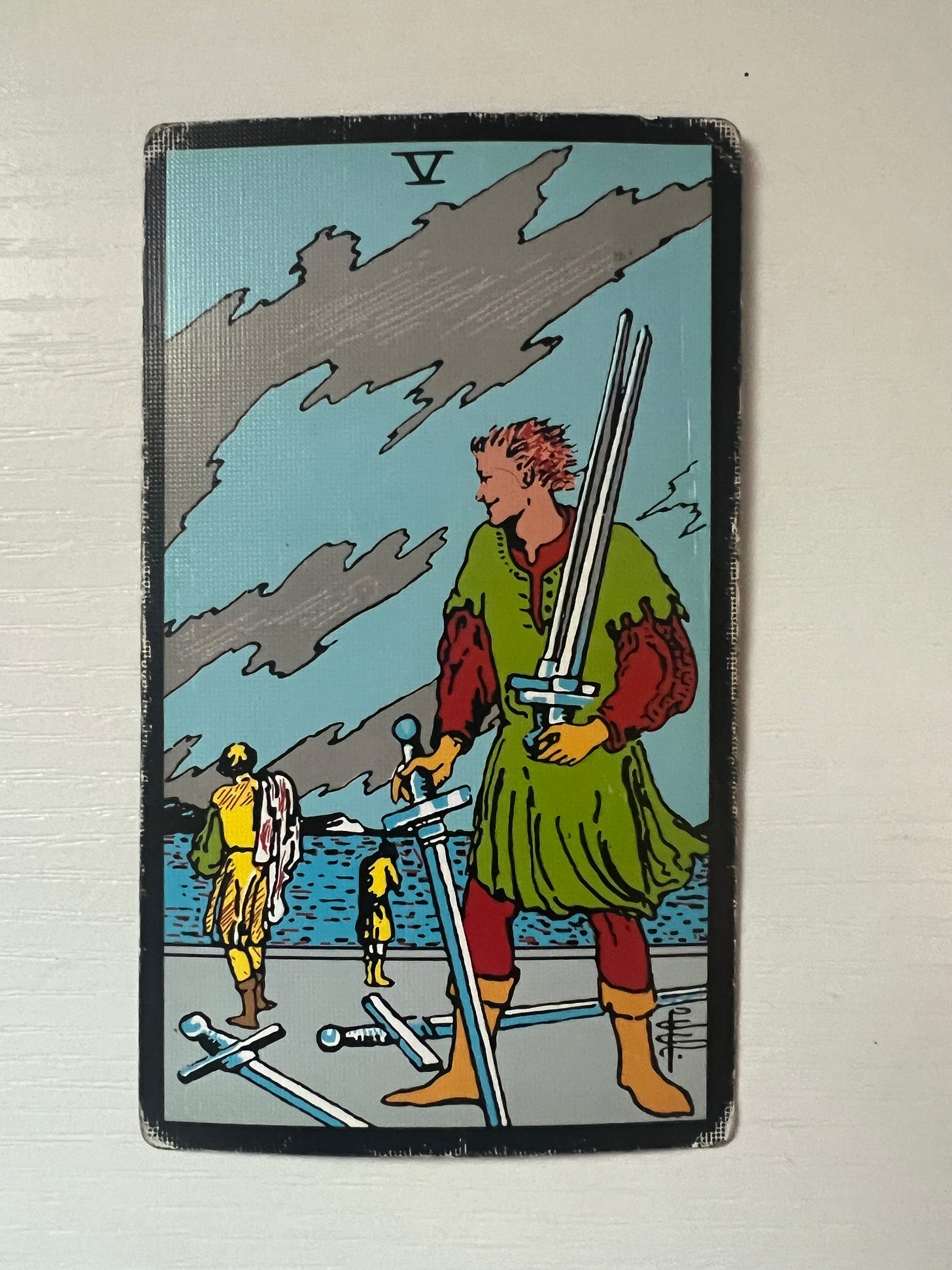 Five of Swords is never fun to get. Nobody’s winning because ego is running the show. If you overly focus on besting a situation or how a situation seemingly bests you, you misalign yourself. The typical message drawn from this is to pull away from ego and back into your intuitive, grounded self.